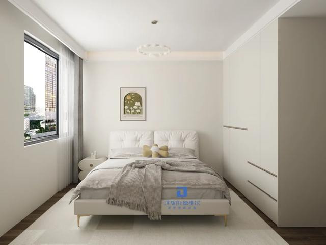 杏白色系的卧室,既有白色的纯净感,又融入了一丝淡雅的暖调,营造出温馨、舒适且富有质感的居住氛围。